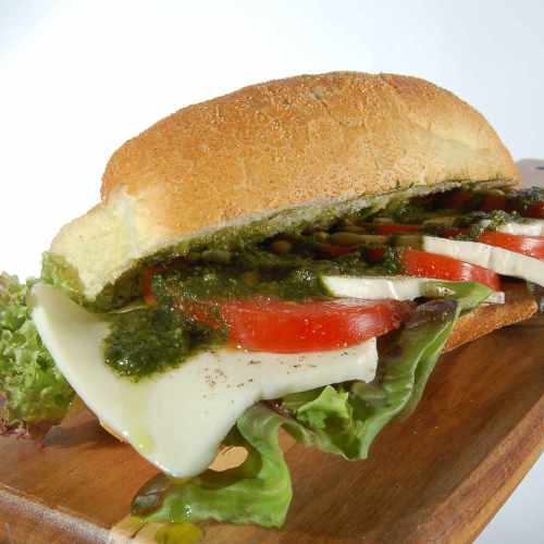 Bestel het Broodje Caprese – Mozzarella, Tomaat & Pesto