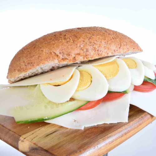Broodje met geitenkaas, tomaat, komkommer, sla, ei en mayonaise.